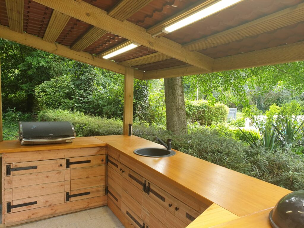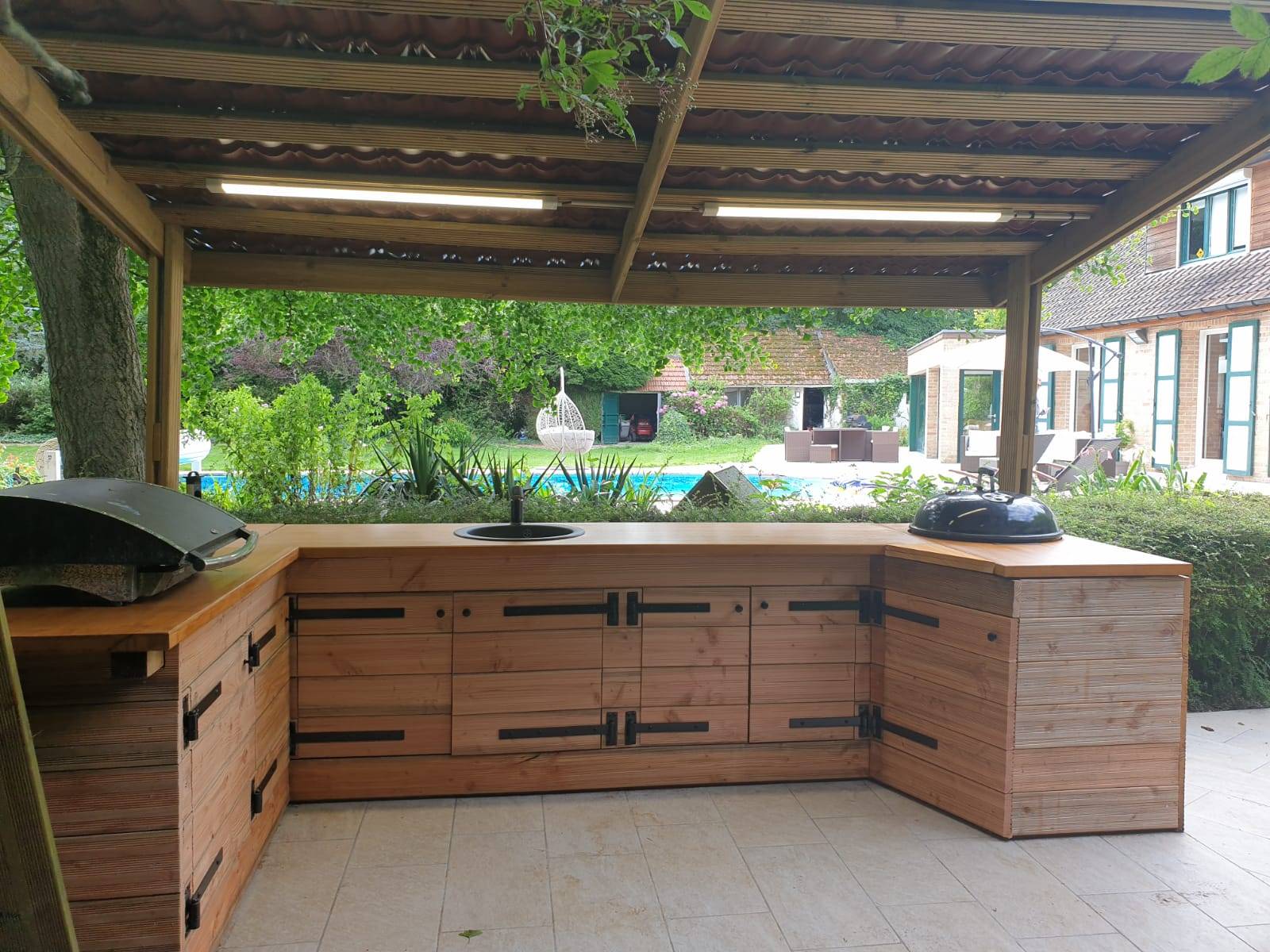 La cuisine en bois résiste aux éléments tout en ajoutant une touche rustique, tandis que la pergola offre un abri élégant pour des moments en plein air. Ensemble, ils créent un coin extérieur fonctionnel et esthétiquement plaisant, fusionnant convivialité et harmonie naturelle.