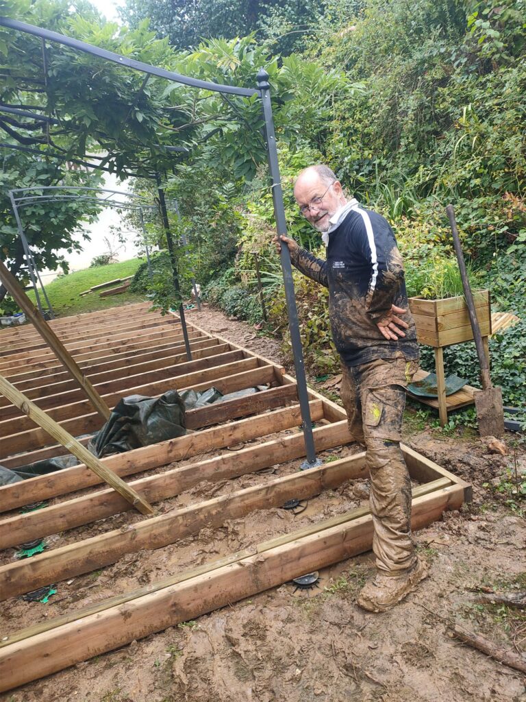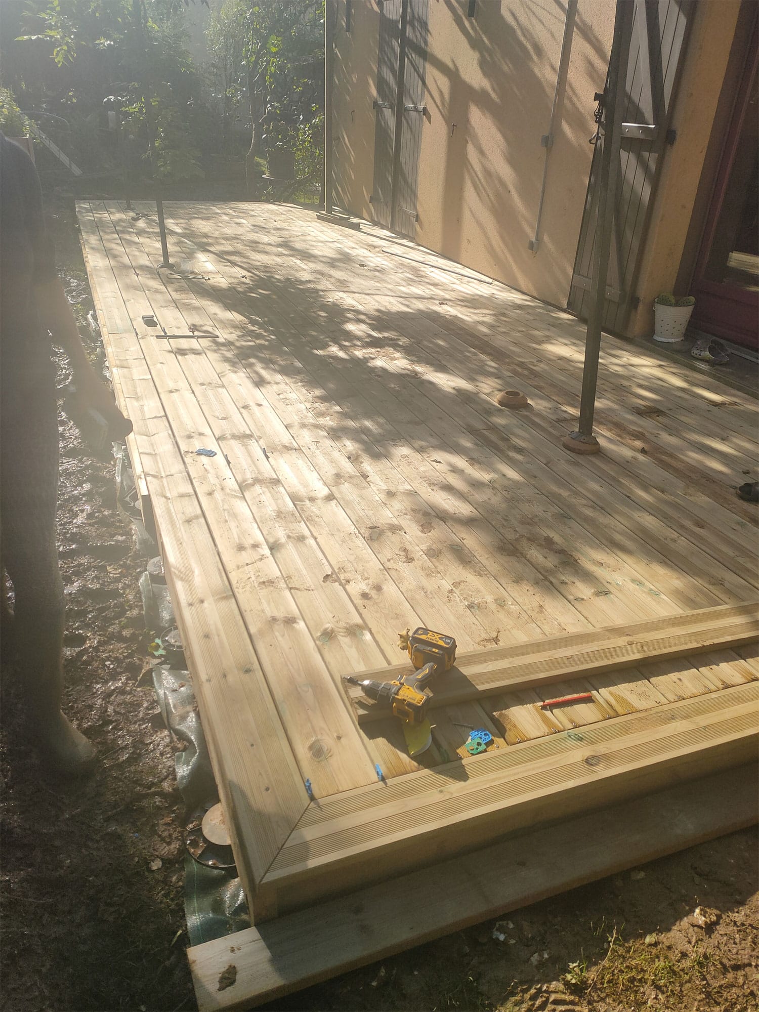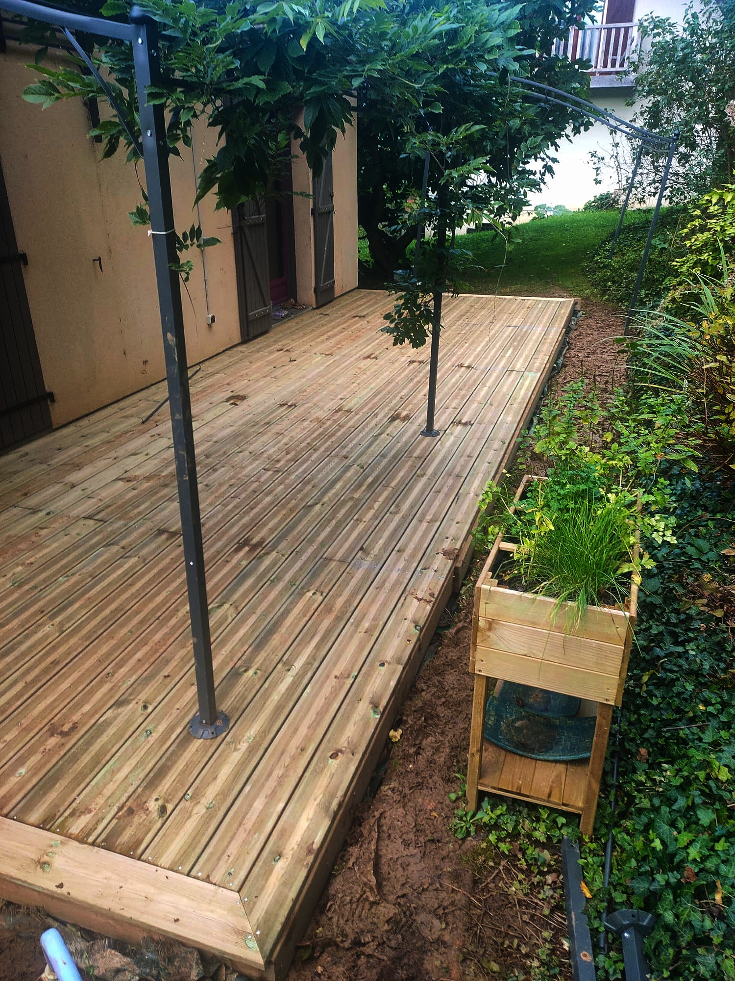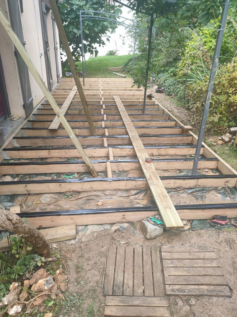 Réalisation d’une terrasse bois sur sol meuble avec travail de terrassement.